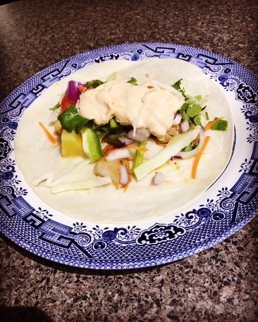 Fy the marinated fish fillets in the oil, place on warmed wraps ,top with salad ingredients and then place the creamy dressing on top , Enjoy!